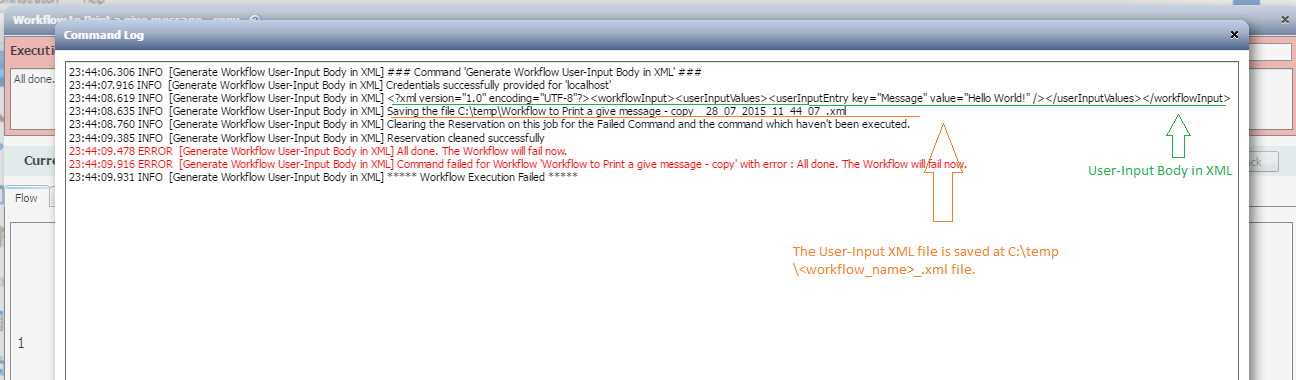 7. You'll see that the our magical command "Generate Workflow User Input Body in XML" has failed in our clone workflow execution. Don't worry, its fate was decided to be so. But it didn't fail before giving me what I really wanted. i.e. my XML body for my real workflow. It displayed it in the GUI as well as saved it in your WFA server @ C:\temp\<workflow_name_dd_MM_yyyy_hh_mm_ss_.xml