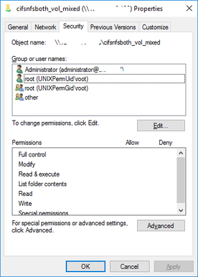 When we access the CIFS share on windows machine and view permissions it shows UnixPermUid\root, UnixPermGid\root and UnixPerm\other for local Unix users and groups.