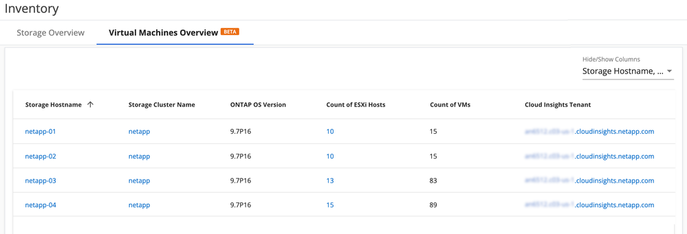 Customers with Cloud Insights Basic Edition will see the number of ESXi hosts and virtual machines per node / cluster as well as the Cloud Insights tenant for that cluster.