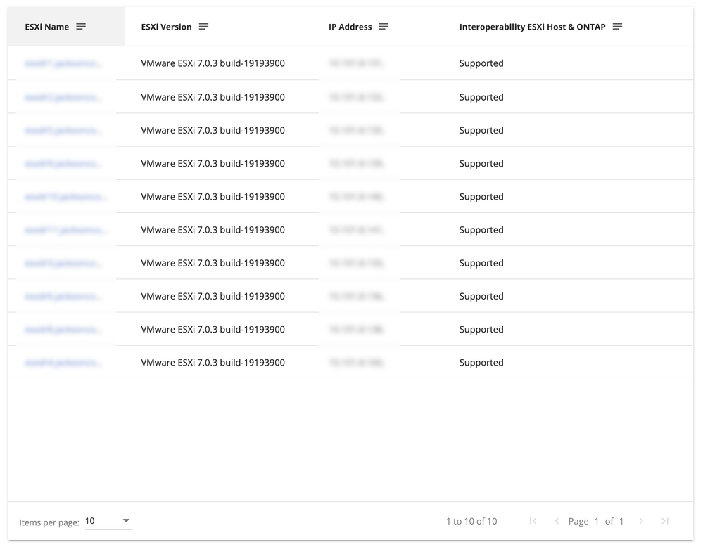 Clicking on the count of ESXi hosts will show you additional detail, such as ESXi name, version, IP address, and interoperability with your current ONTAP version.