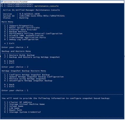 - From the Backup and Restore Menu, choose Option 2, Backup and Restore using NetApp Snapshot.