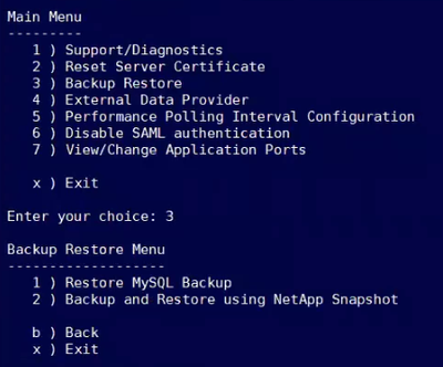 - After the destination volume is configured, let’s configure the backup by selecting option 3 Backup Restore from the Main Menu in the maintenance console.
