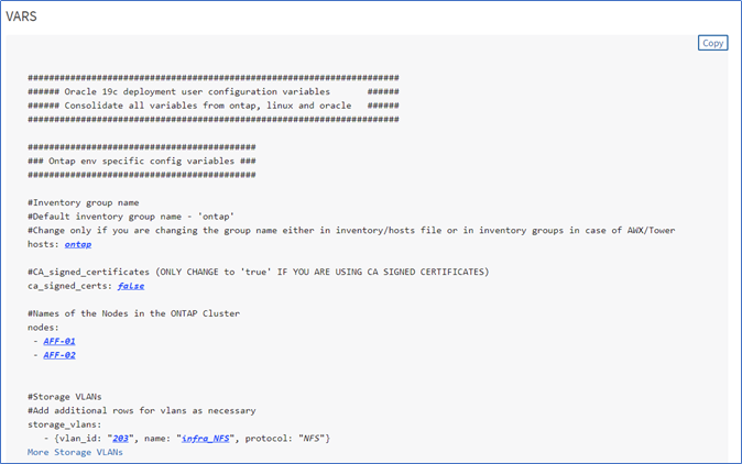 Regardless of the number of Oracle hosts and the number of container databases you deploy on a single Oracle host, your playbooks are executed the same way without requiring you to change a single line of code. The deployment consists of setting up your Ansible controller and then copying and pasting your user defined parameters, as noted in column 3 in the previous table, to AWX or CLI variable files before execution. To help you with the user defined parameter file configuration, a variables generation form is embedded in the deployment instruction page that allows you to enter parameters while going through the deployment instruction details. A copy button on the form allows you to easily transfer your user definable parameters to the Ansible runtime environment.