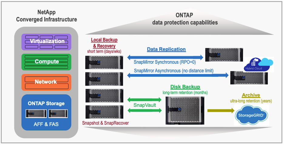 To start, let’s take a look at the key data protection capabilities native to ONTAP – Snapshot, SnapRestore, SnapVault, SnapMirror sync & async, plus archival solution.