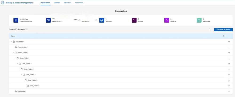 At the top of the hierarchy is a business or organization. By arranging resources in folders, customers can more effectively organize them within an organization. A folder can represent a business unit or group within an organization (marketing vs. sales, etc.) or a location (e.g., us-east, us-west, EU, or APAC). Each customer may have up to eight different kinds of folders. You can use a folder as an optional structure to group NetApp resources together. The standard method that users use to organize their ONTAP resources is using the project structure, which is supported by us and can be accessed under the folder. A company could be working on several projects at once.