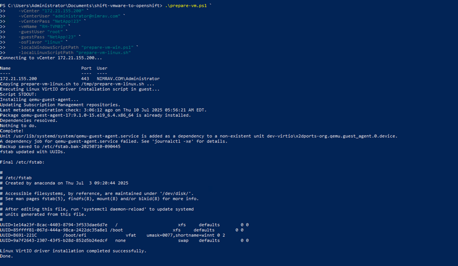 Shift toolkit runs the VirtIO driver, qemu-agent installation and fstab update script. To accomplish the same, Shift toolkit uses powercli to connect to the guest VMs (Linux or windows) and updates the VirtIO drivers ensuring the necessary drivers are available once the VM boots up on OpenShift side.