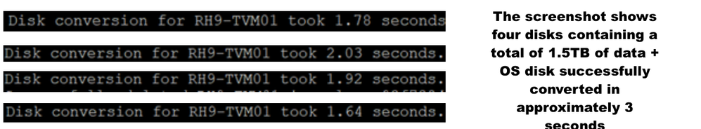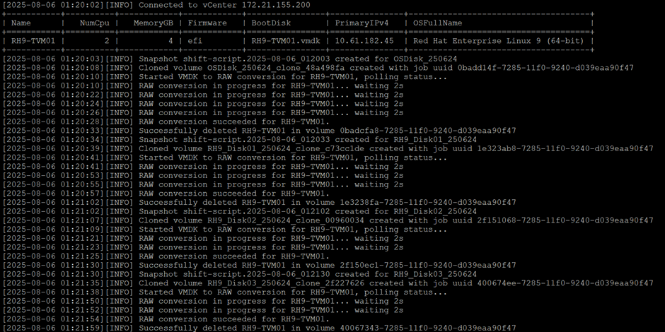 Once the json file is updated, the script will automatically find the VMDKs associated with each VM including the primary boot disk. The conversion happens in seconds compared to other approaches.