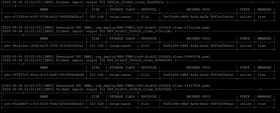 With the virtual machine disk image converted to RAW format, script uploads the RAW file to OpenShift cluster and import them individually using trident.