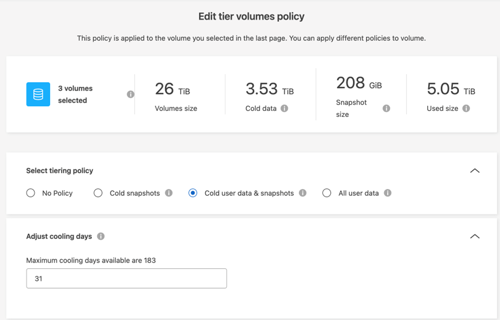 The other default setting that can be customized is cooling days, which specifies the number of days data is inactive before it is moved to object-based storage. It can be anything between 2 and 183 days. The default value for the cold snapshots policy is 2 days, and for cold user data and snapshots it’s 31 days. A shorter cooling period will let tiering move data that quickly becomes outdated, such as the data for temporary short-spanned projects, sooner than it normally would, enhancing efficiency and savings. Yet, most users stick with the default period to avoid premature tiering and potential extra retrieval costs.