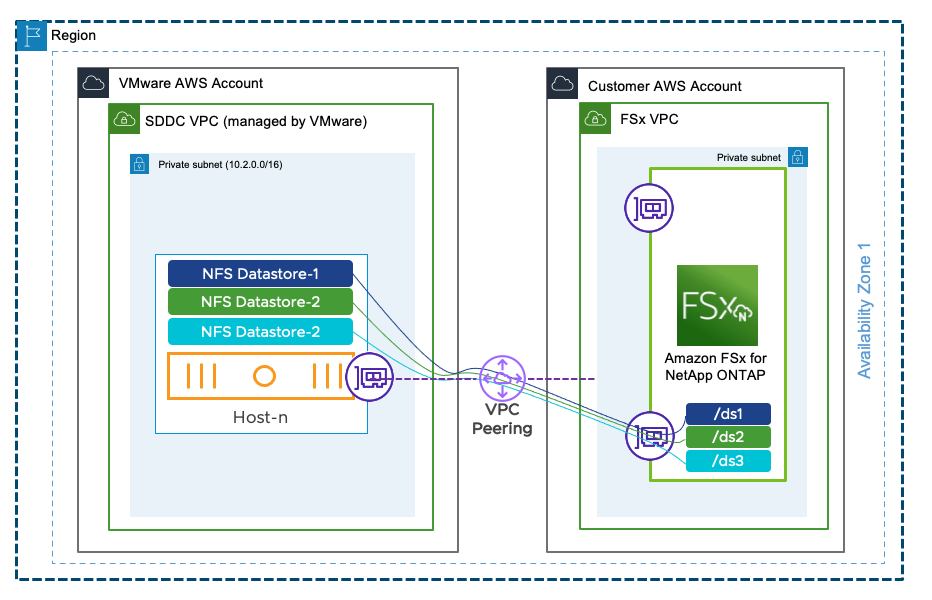 For more information on how VPC Peering works with FSx for ONTAP Single AZ configurations, please refer to VMware's blog: https://vmc.techzone.vmware.com/resource/feature-brief-vpc-peering and release notes for SDDC version 1.24 https://docs.vmware.com/en/VMware-Cloud-on-AWS/services/rn/vmware-cloud-on-aws-release-notes/index.html